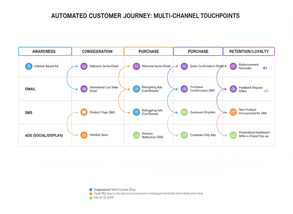 Cross-channel coordination is essential. Customer journeys fail when email says one thing, ads say another, and SMS sends unrelated messages. Automated journeys must sync communications across email, ads, SMS, chat, and in-app messaging.