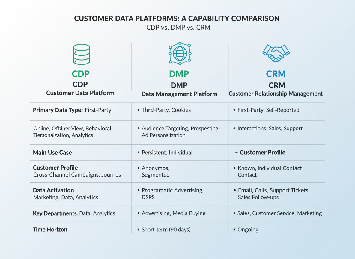 CRMs cannot handle real-time personalization. DMPs cannot store PII. CDPs can do both — legally and effectively.