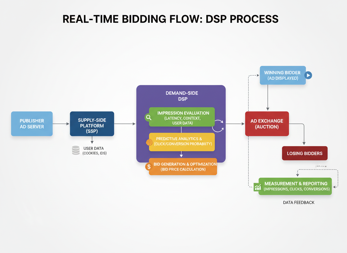Within milliseconds, the DSP evaluates the user profile, applies targeting rules, checks frequency caps, analyzes historical performance, considers budget pacing, and predicts conversion probability using machine learning models. If the user is valuable, the DSP submits a bid.