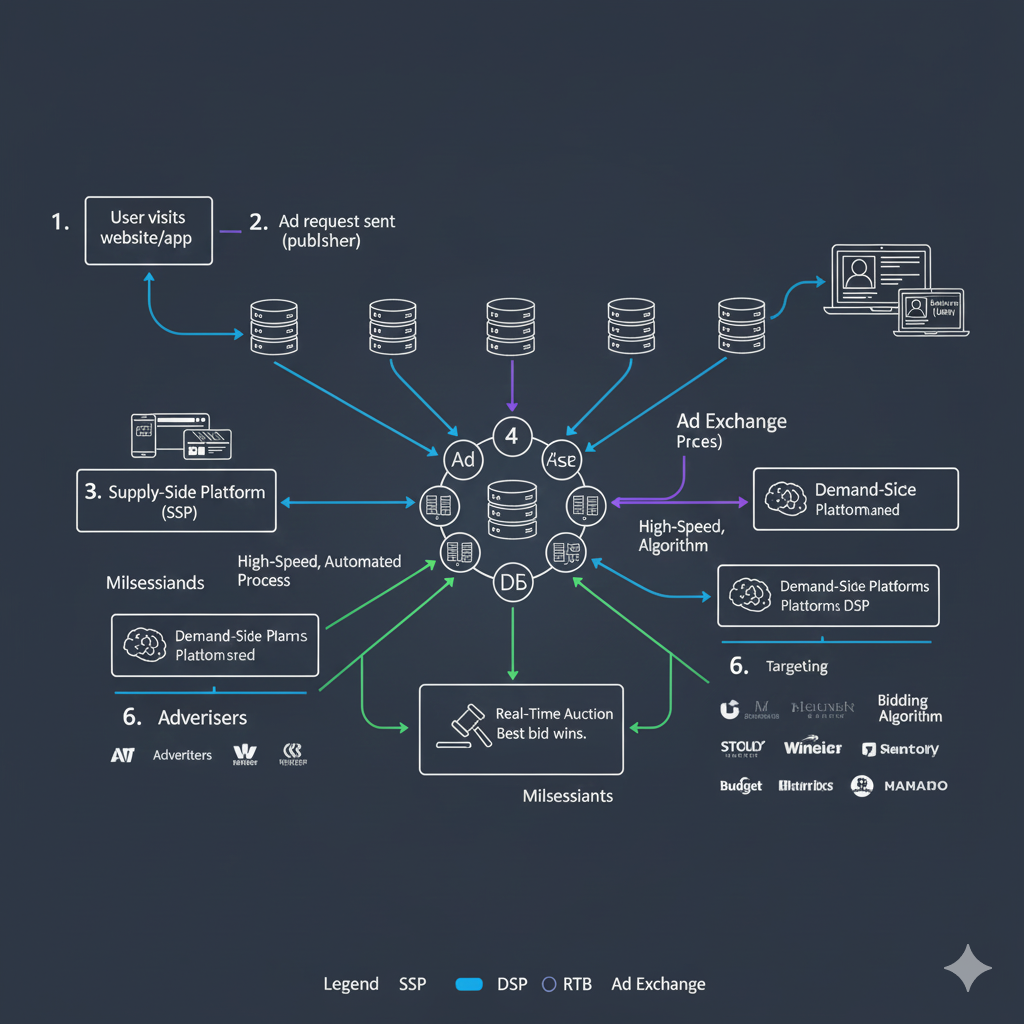 Several key platforms make programmatic advertising possible. Demand-Side Platforms (DSPs) allow advertisers to buy ad inventory across multiple publishers. Supply-Side Platforms (SSPs) help publishers sell their ad space efficiently. Ad Exchanges act as marketplaces where DSPs and SSPs connect.